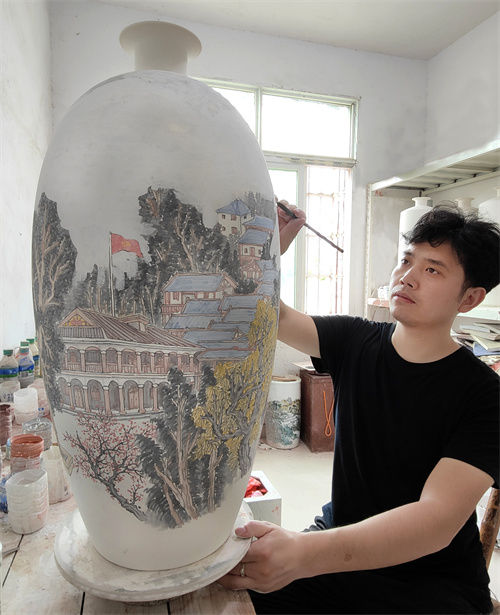 国家一级美术师、陶瓷艺术家谢古道正在创作参展作品