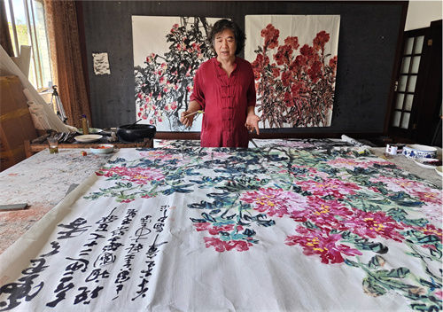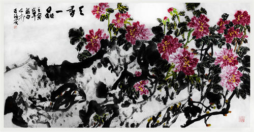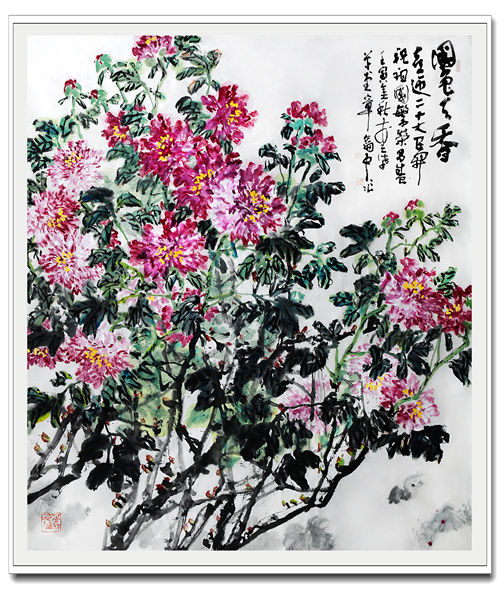 浙派著名花鸟画家章龠中创作的大幅写意牡丹佳作《国色天香》,悬挂在展厅最显眼的位置,倍受参观者关注。系列花鸟画作品,画家以红色喜庆为基调,精心创作了《鸿运当头》、《紫玉飘香》、《万事如意》、《硕果累累》、《火红年代》等20幅大作,歌颂赞美伟大祖国取得的辉煌成就。