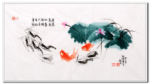 张德文花鸟作品《荷花盛开鱼虾欢》